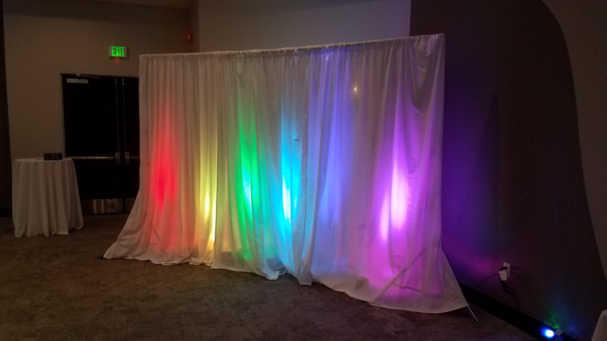 Perimeter lighting with wedding colors shown. Light curtains supplied by 3rd party.