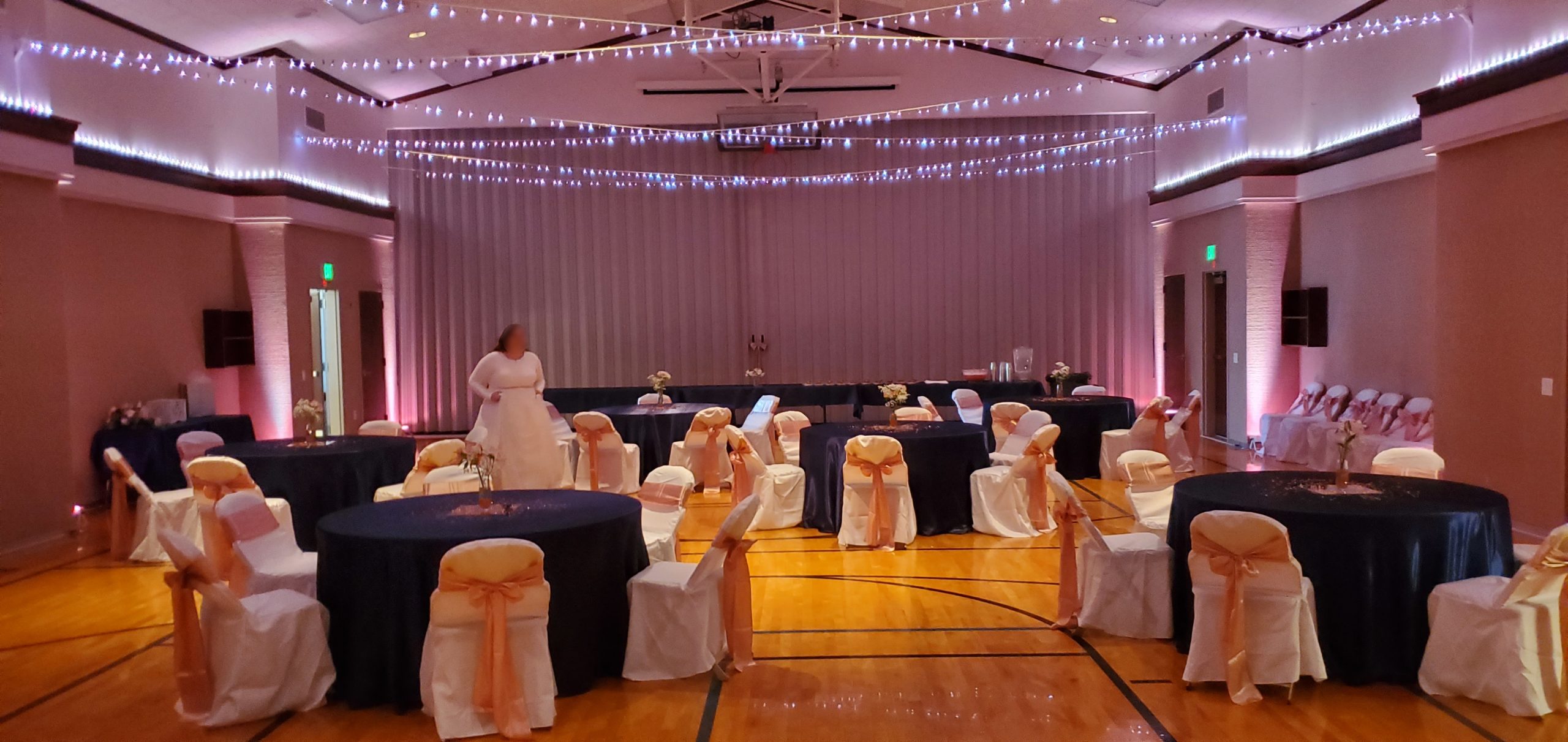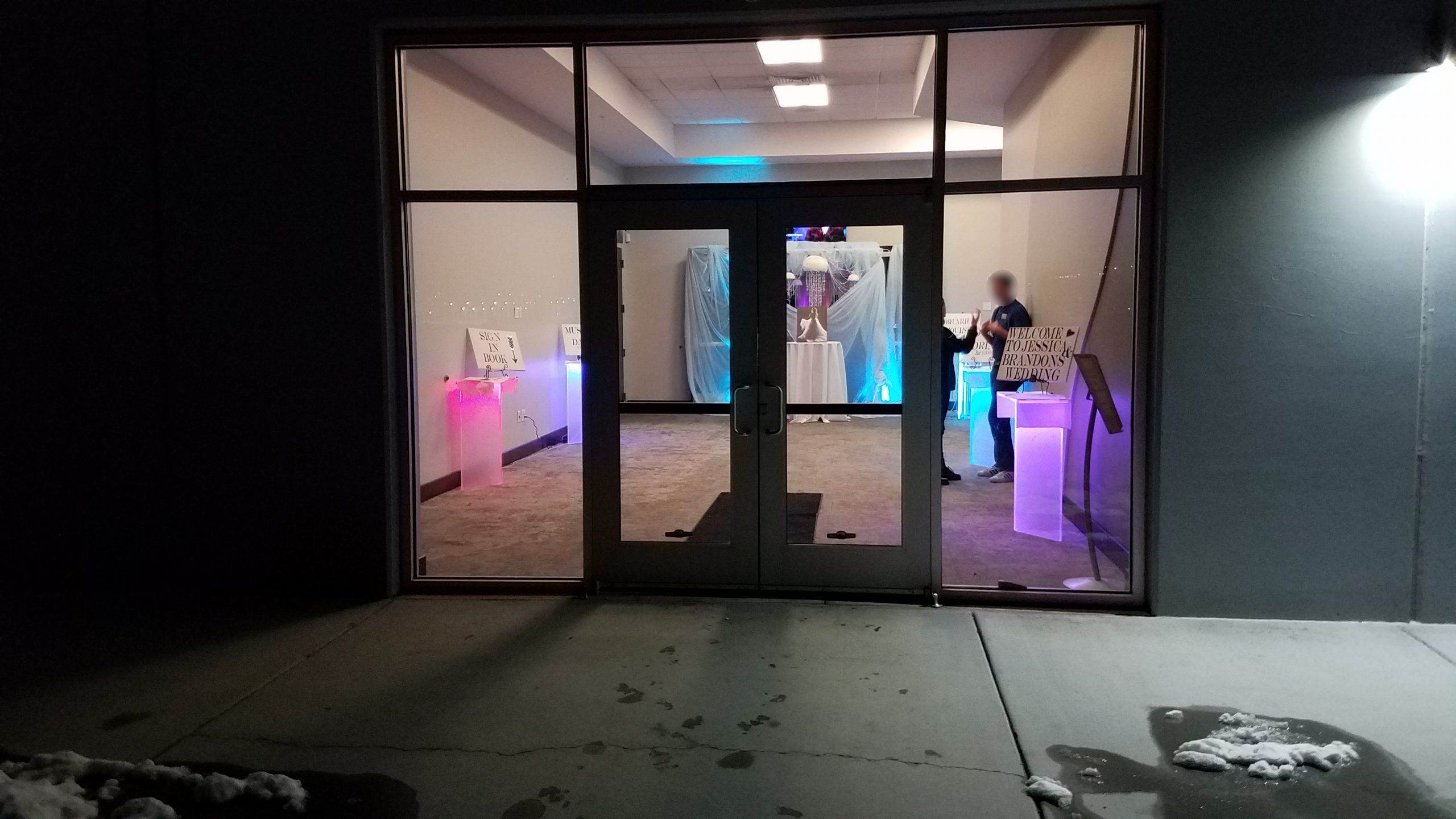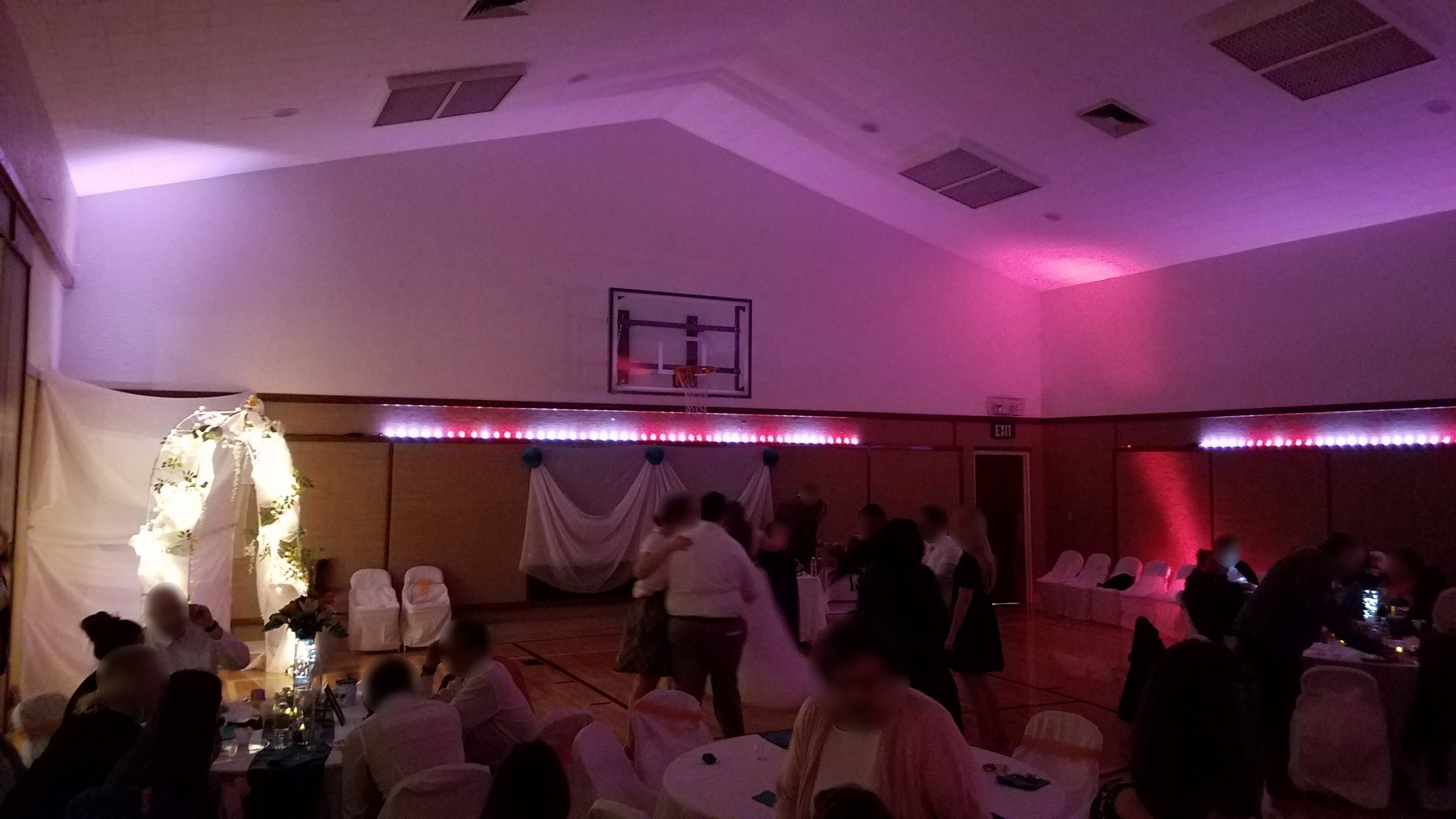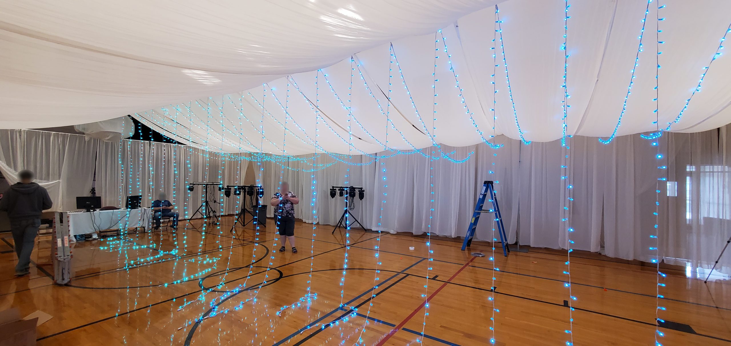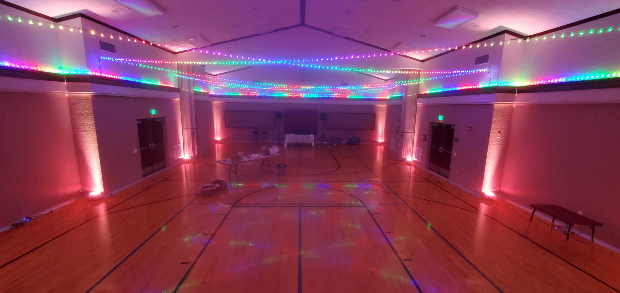 View of room from entry. 2 stand lighting system with full perimeter up lights. Real time PC control. Christmas lights, chandelier & signage supplied by 3rd party.