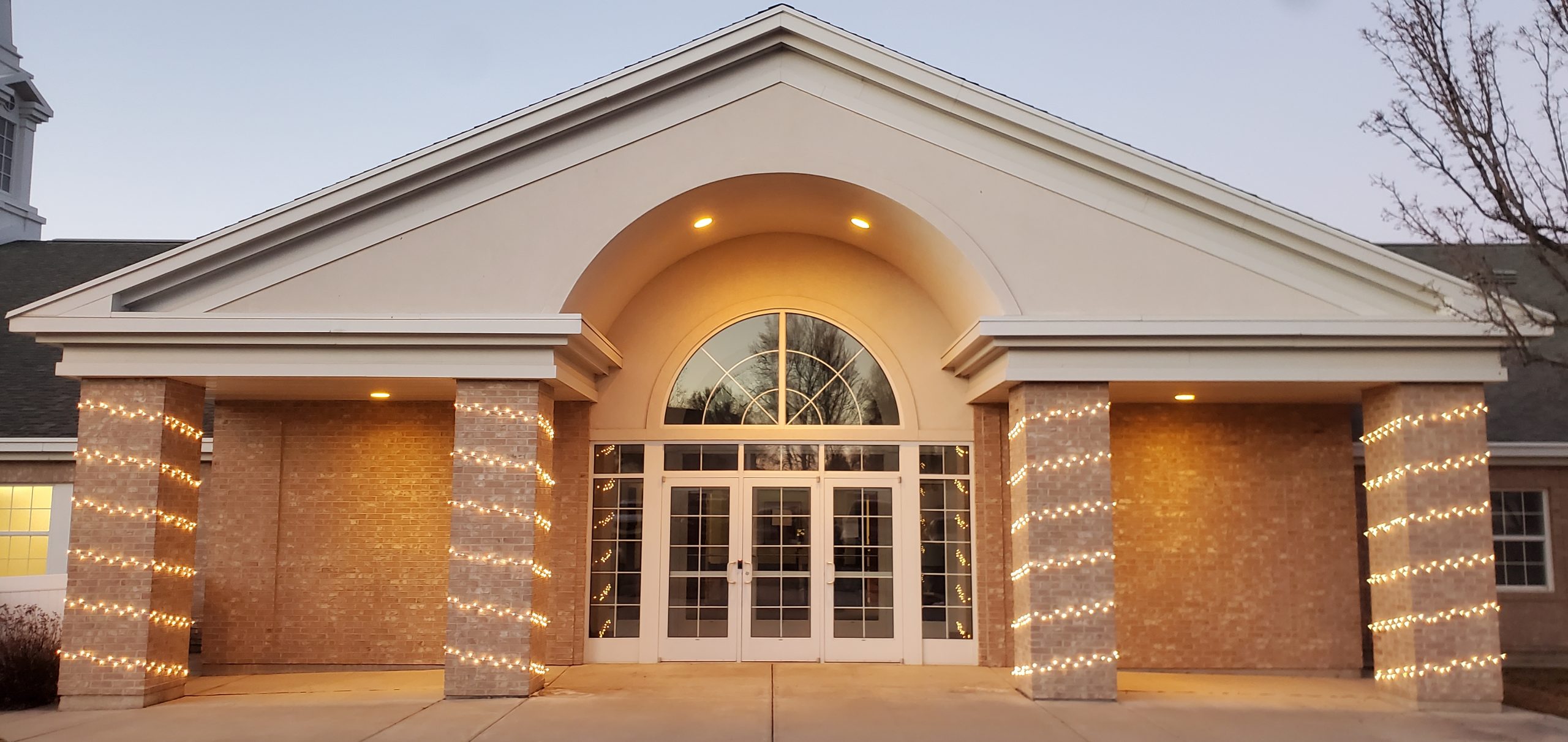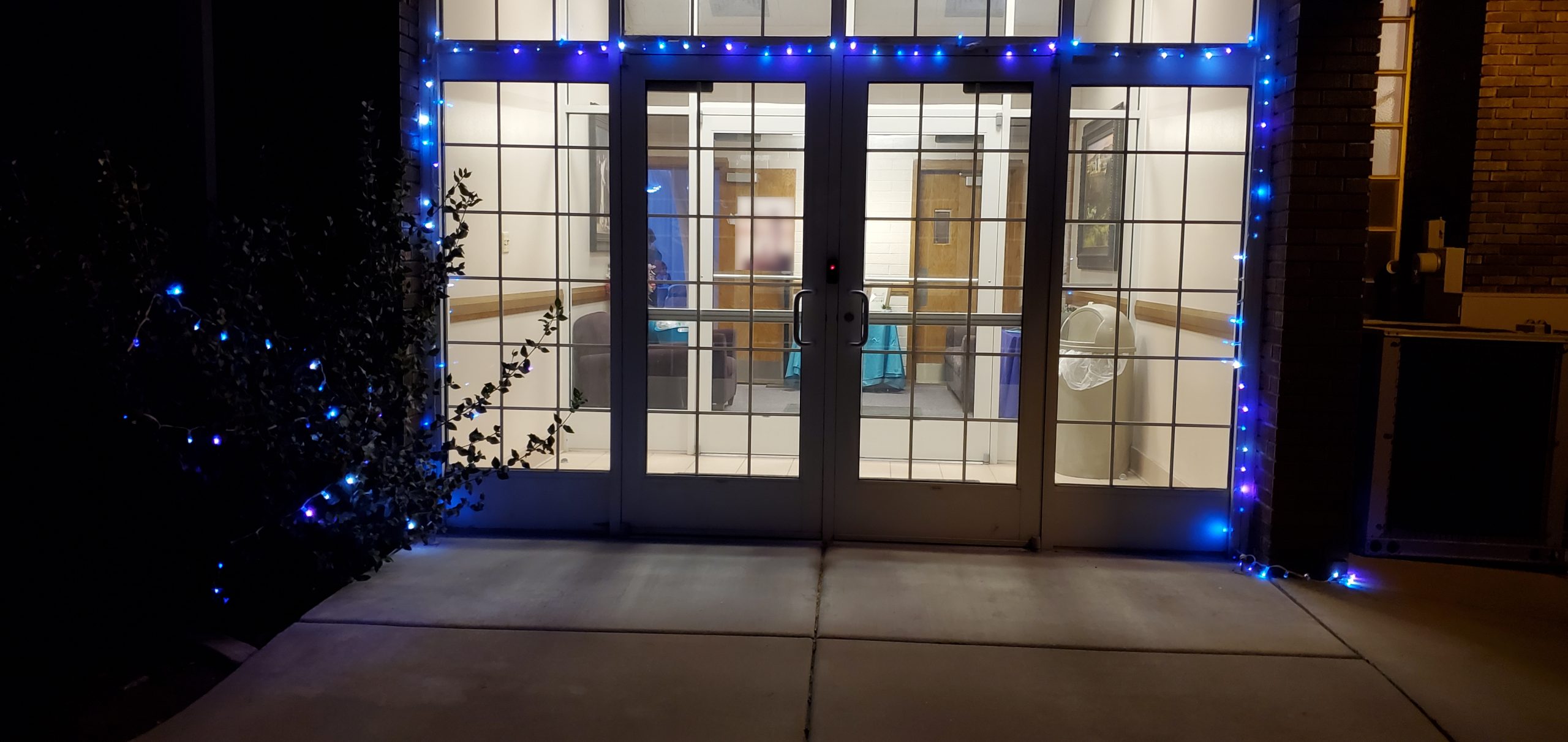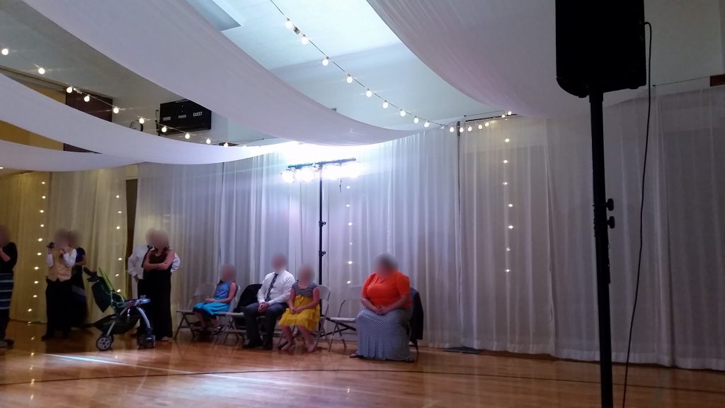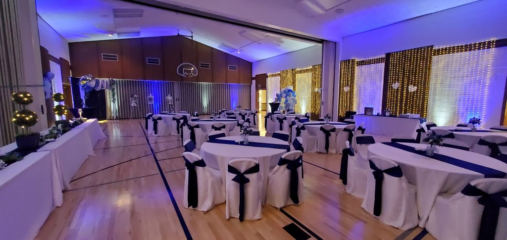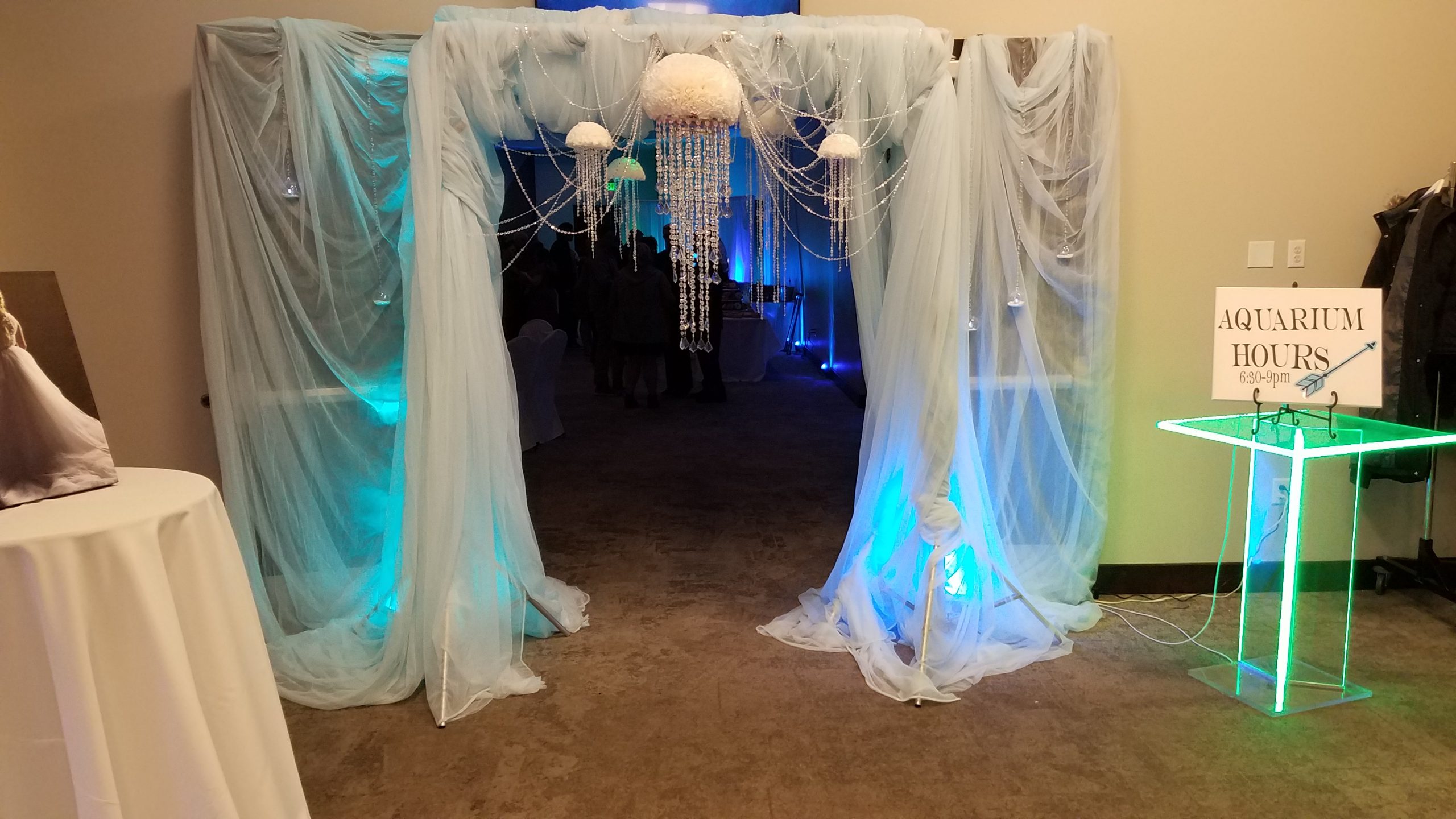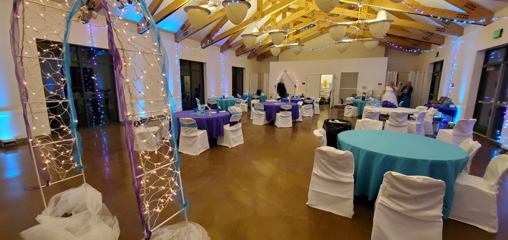 View of room from entry. 2 stand lighting system with full perimeter up lights. Real time PC control. Christmas lights, chandelier & signage supplied by 3rd party.