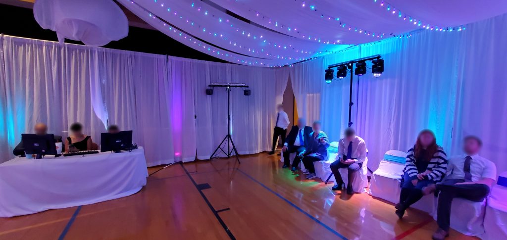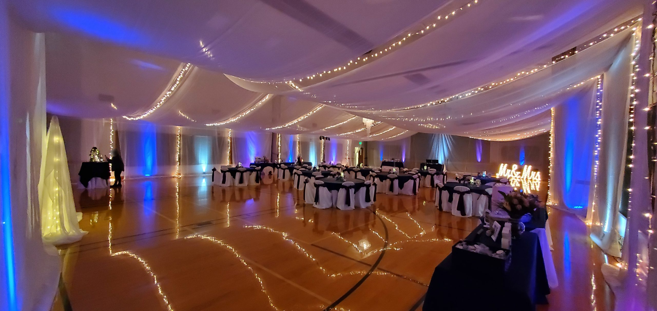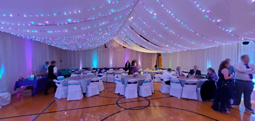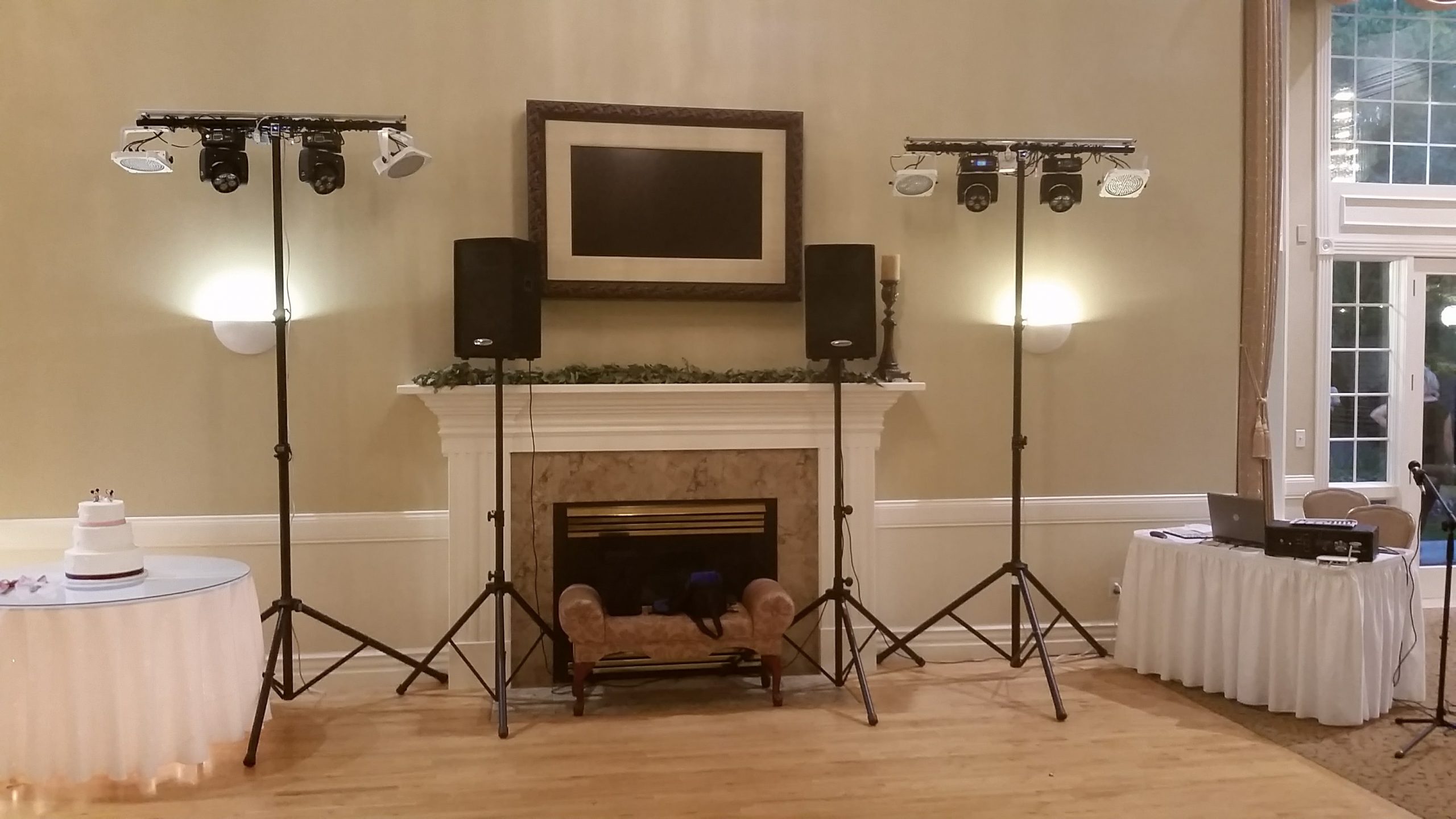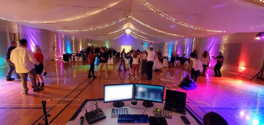 View of room from DJ HQ. 2 stand lighting system with full perimeter up lights. Real time PC control. Christmas lights & chandelier supplied by 3rd party.