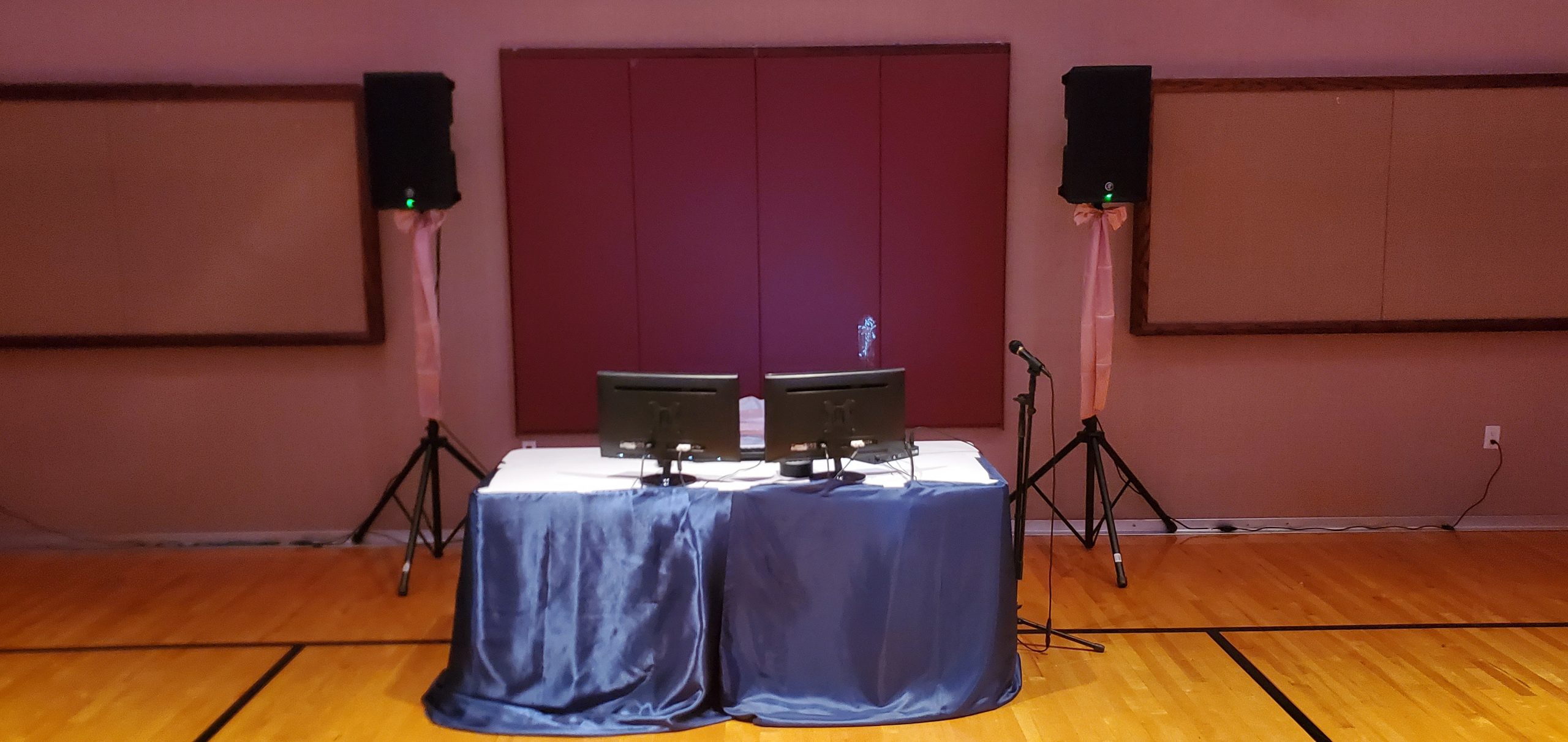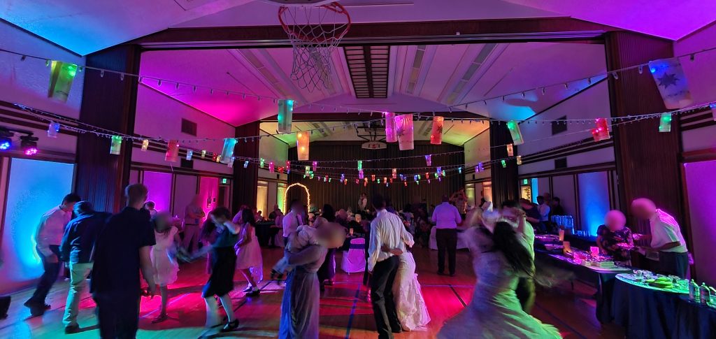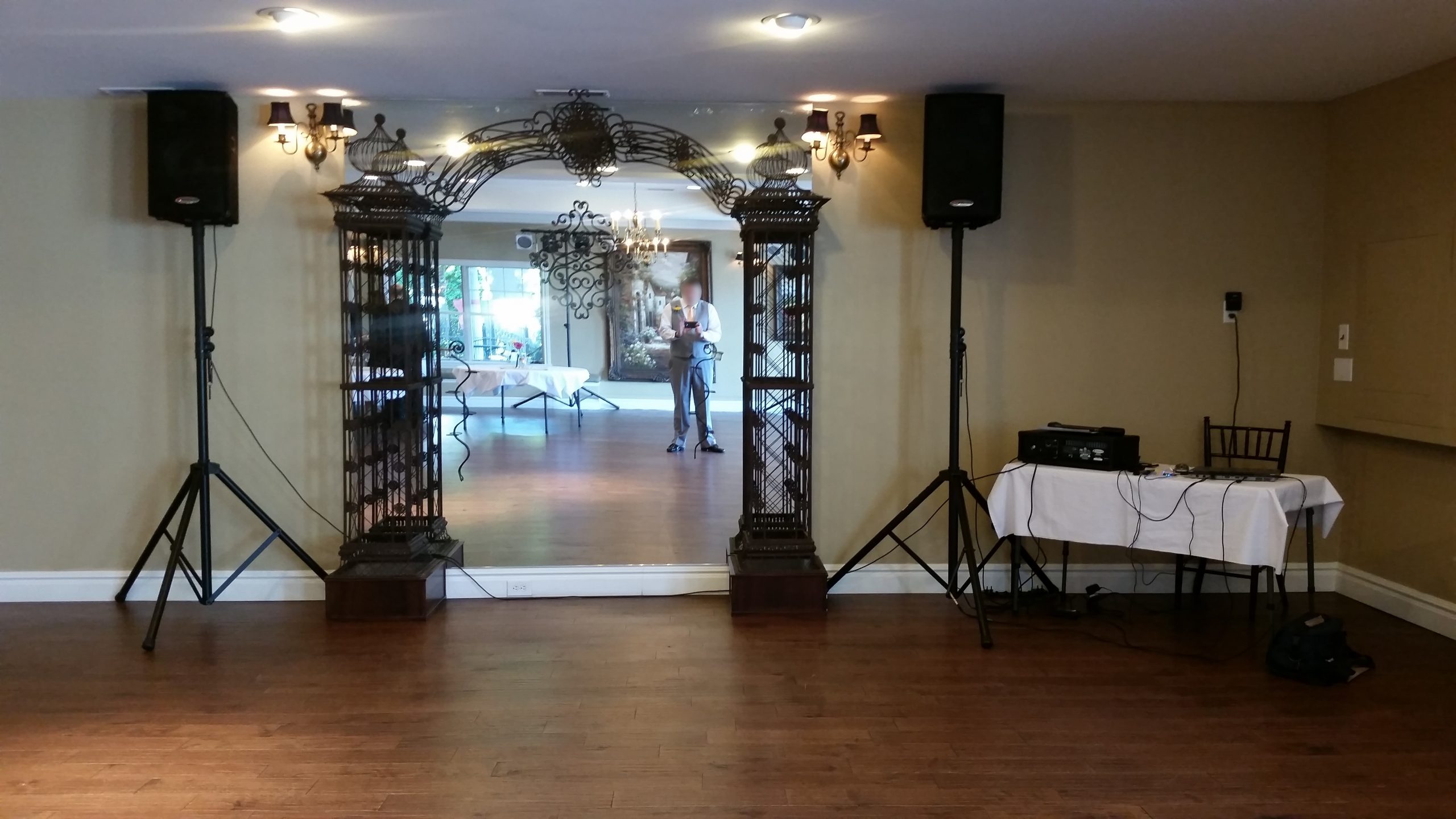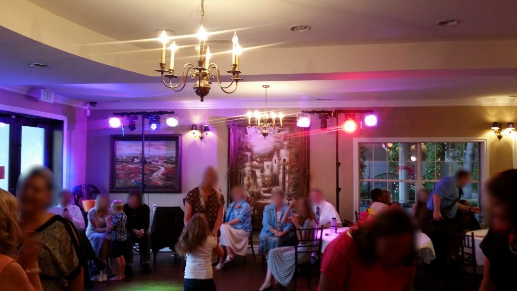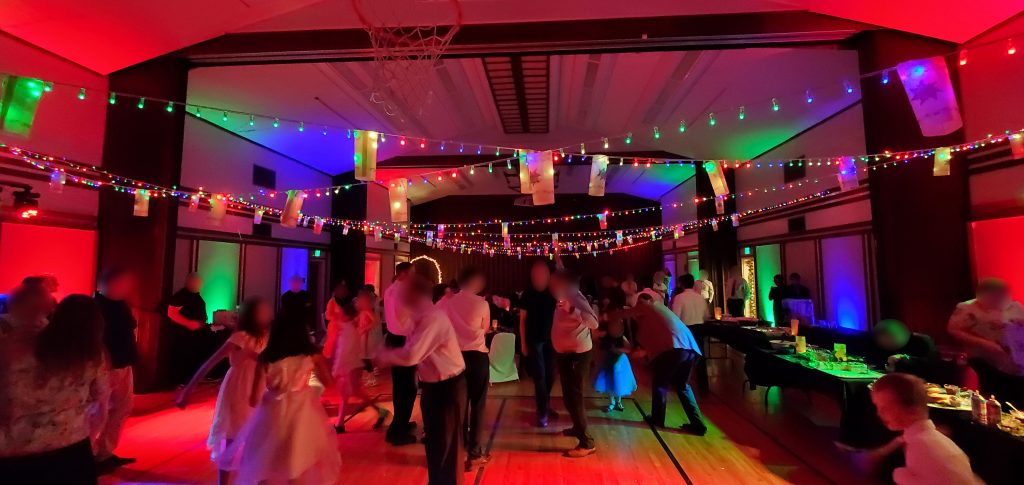 View of room from DJ HQ. 2 stand lighting system with full perimeter up lights. Real time PC control. Christmas lights & chandelier supplied by 3rd party.